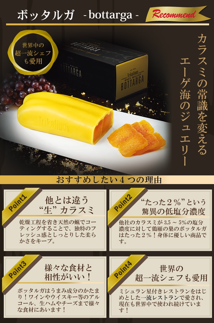 エーゲ海を中心とした地中海で捕れたボラの卵だけを使った大変フレッシュなカラスミで、ウニを思わせるような深い味わいはギリシャのキャビアとも呼ばれています。ドライスプマンテやシャルドネなどミネラル感のある白ワインと相性が抜群です。外側の黄色い蜜蝋を剥がしてからご使用ください。
