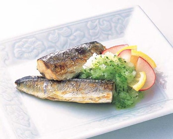 鮮度のよいさんまの骨を取り除き、ドレスした後、カットして塩焼にしました。