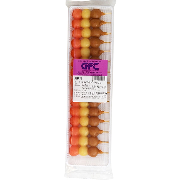 国産の米粉を使用した風味豊かなコシのある三色だんごです。大きさは約15Gと大変可愛く、実りの秋、紅葉の秋をイメージした彩りに仕上げました。秋のお食事、お弁当、さらにはパフェなど色々な料理に風味とともに彩りを添えていただける商品です。