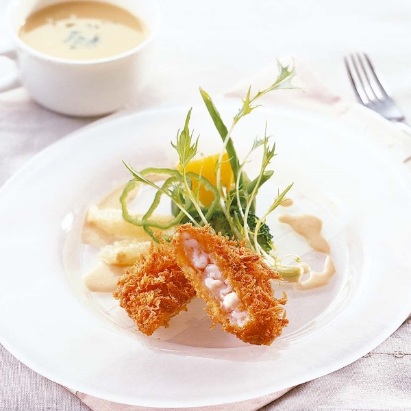魚やえびのすり身を使用せず、むきえびを並べてパン粉付けしました。えびの食感と味わいを感じられるえびカツです。