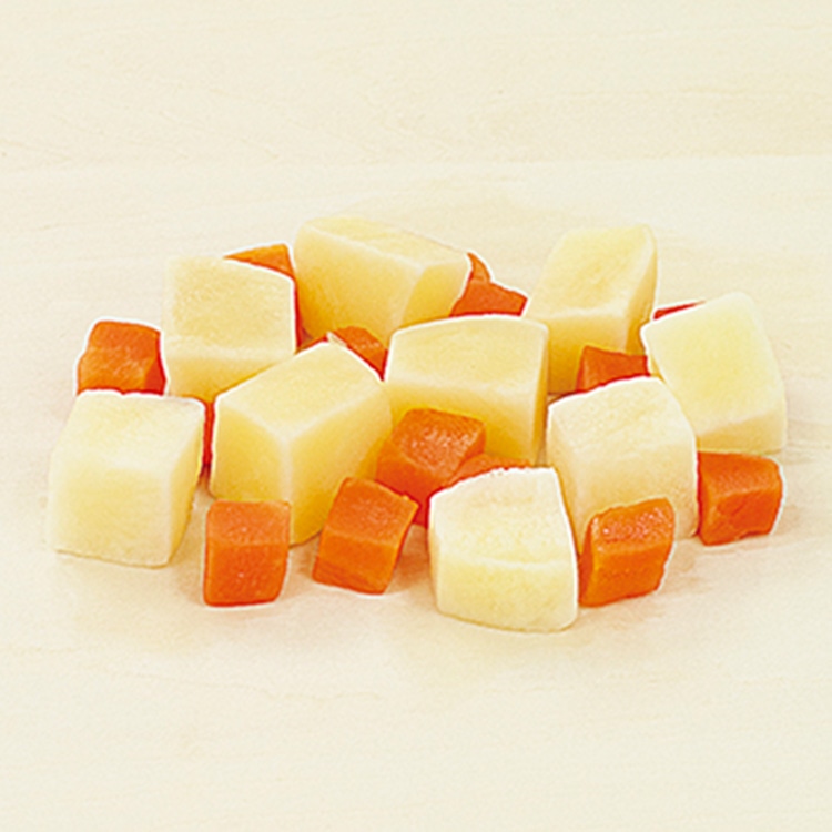 カレーライス用に15mmの角じゃがいもを80%と、15mmの角にんじんを30%のミックス野菜です。