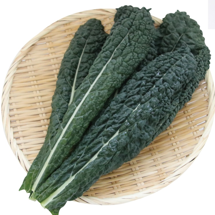 結球しない葉キャベツです。長細く表面は縮れています。別名黒キャベツとも言われています。青汁の「ケール」とほぼ同等の高い抗菌化力と栄養成分で、ビタミンCも豊富です。甘みと旨味も感じられる深みがあり、味と噛み応えのある食感です。味は濃く、クセはありません。煮込みやスープ、炒め物等がおすすめです。