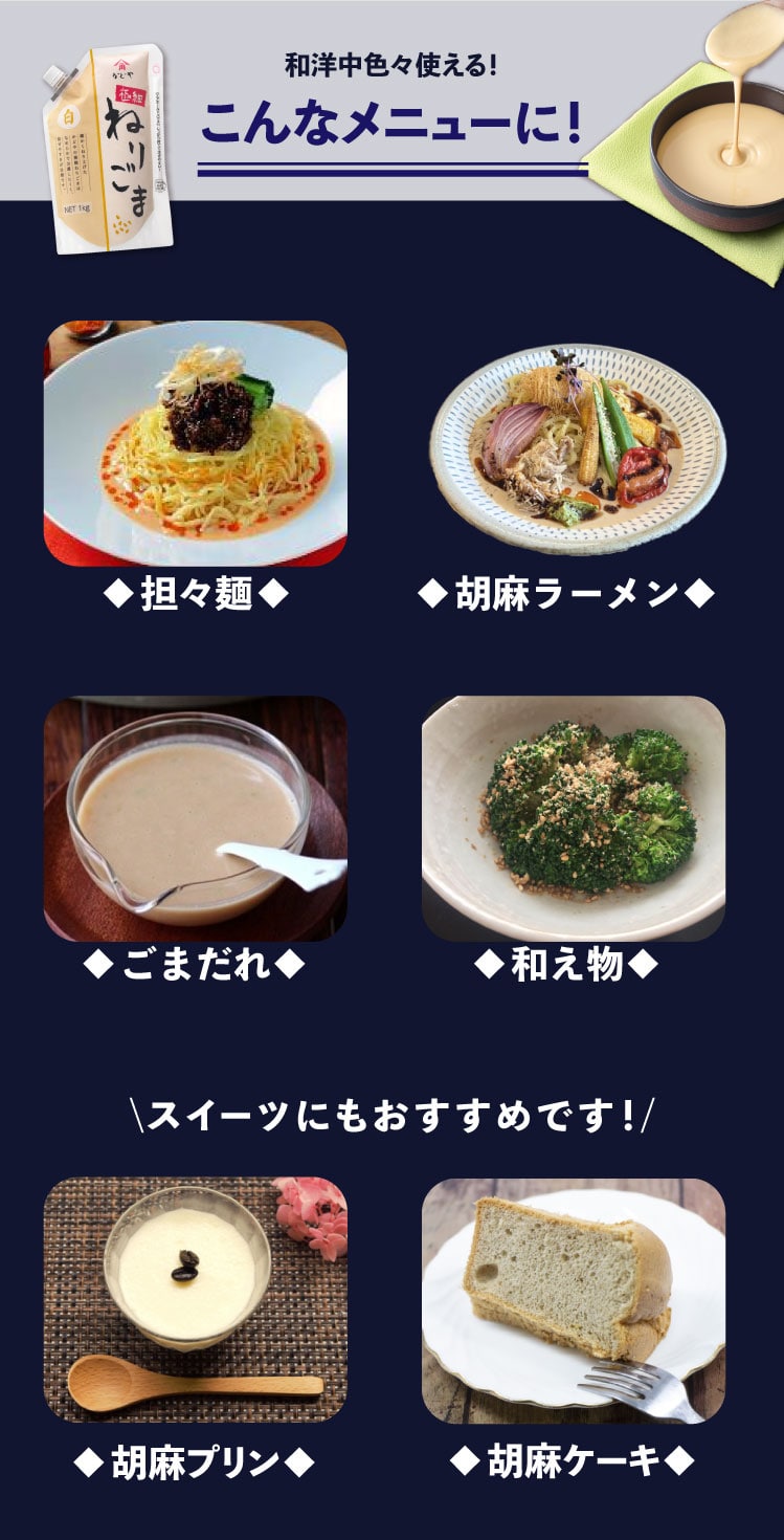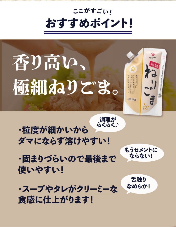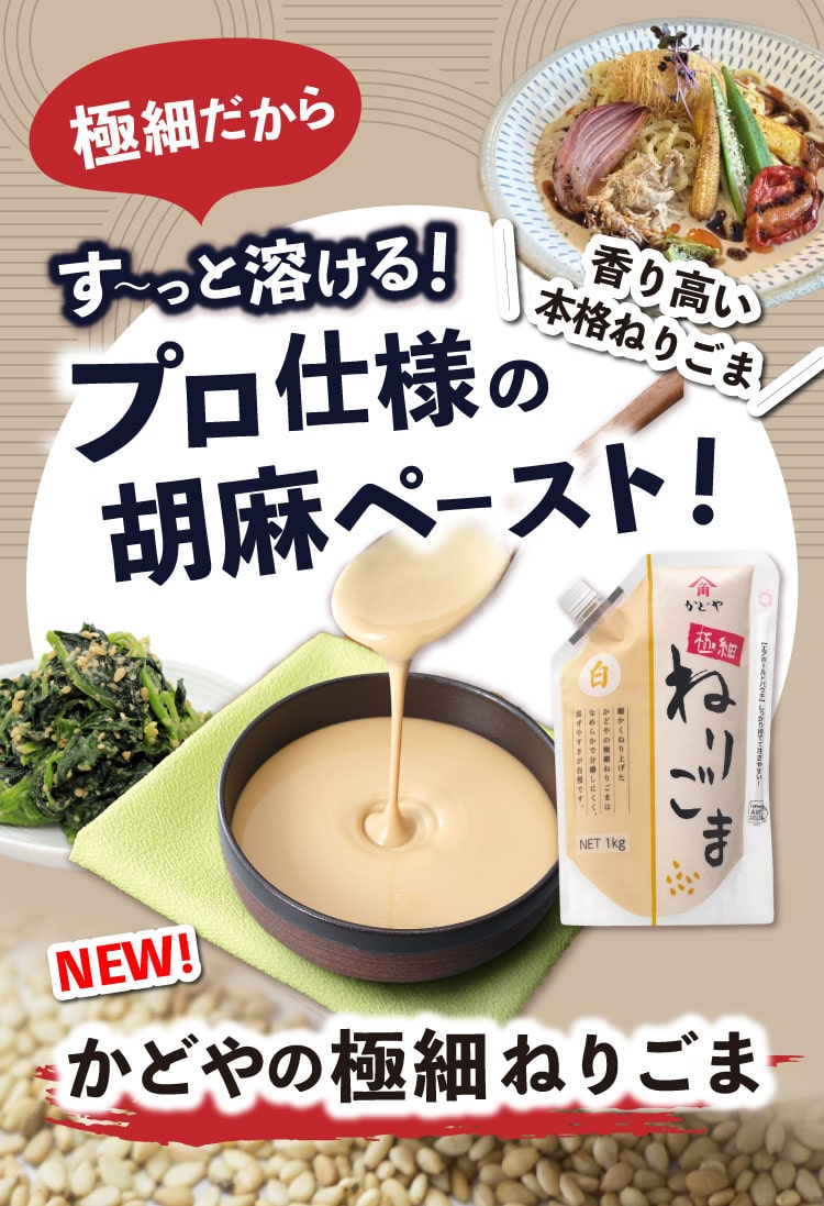 ナッツのような甘みとコク、香ばしい焙煎風味の皮むきいりごまを使用し、仕上げに磨砕によってごまの粒子をより細かくしました。食感のなめらかさと口当たりが良いです。細かくねり上げた極細ねりごまは、なめらかで分離しにくく、硬くなりにい為、調味料類と混ぜやすく、きれいに使い切れます。ごまダレや汁もの類、また本格的なお菓子作り等、幅広い用途に対応できます。