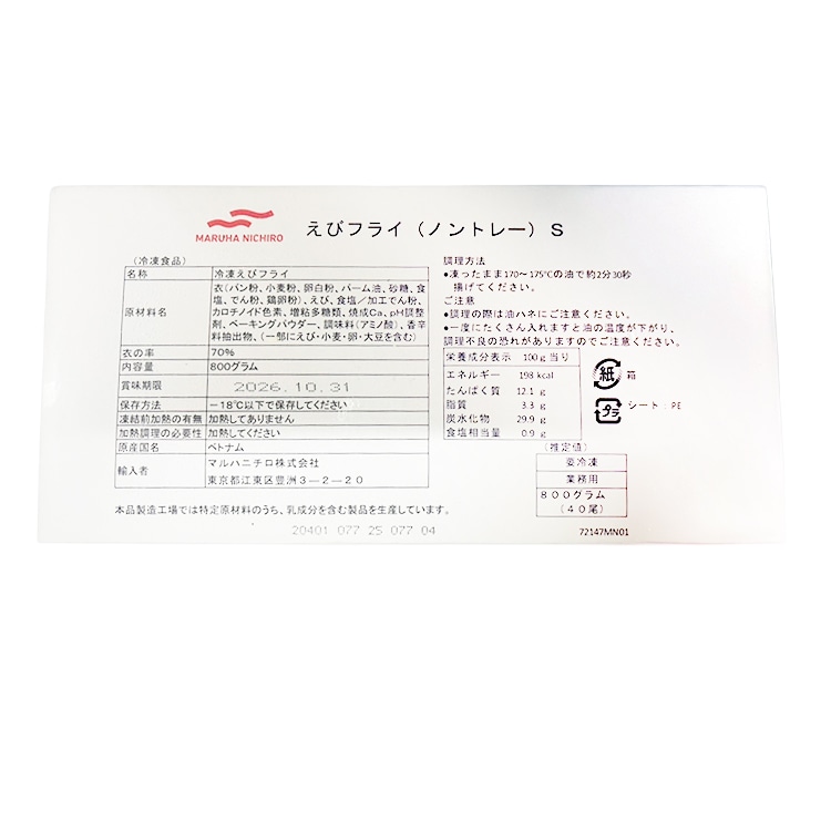 | 商品名 | マルハ)エビフライ(ノントレー) S 20G 40食入 |