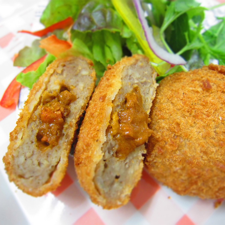 国産鶏肉を使用し、カレーフィリングを中に閉じ込めた、二層タイプのメンチです。ほんのり甘めのカレーソースの香りが食欲をそそります。