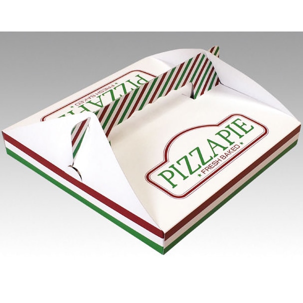 テイクアウト用としてご使用頂けるピザ用取手付のピザ箱です。トップオープンタイプなので、ピザが出しやすくおすすめです。