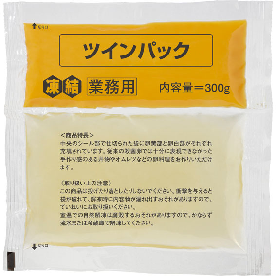 中央のシール部で仕切られた袋に加工卵部と卵白部がそれぞれ充填されています。従来の殺菌卵では十分に表現できなかった手作り感のある丼物などの卵料理をお作りいただけます。