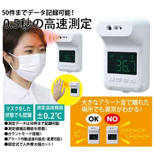 店舗入口での体温管理に。温度異常の場合はアラート音でおしらせ致しますので安心です(アラート作動温度の設定、変更可能)。0.5秒の高速測定、マスクをした状態でも認識致します。