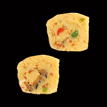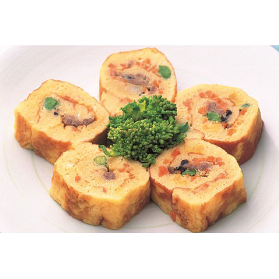 彩り豊かな野菜(にんじん、グリーンピース、とうもろこし)と鶏肉、ハム、チーズ、ひじき等の具材を卵で巻き、カットしました。見た目にも美しい一品です。