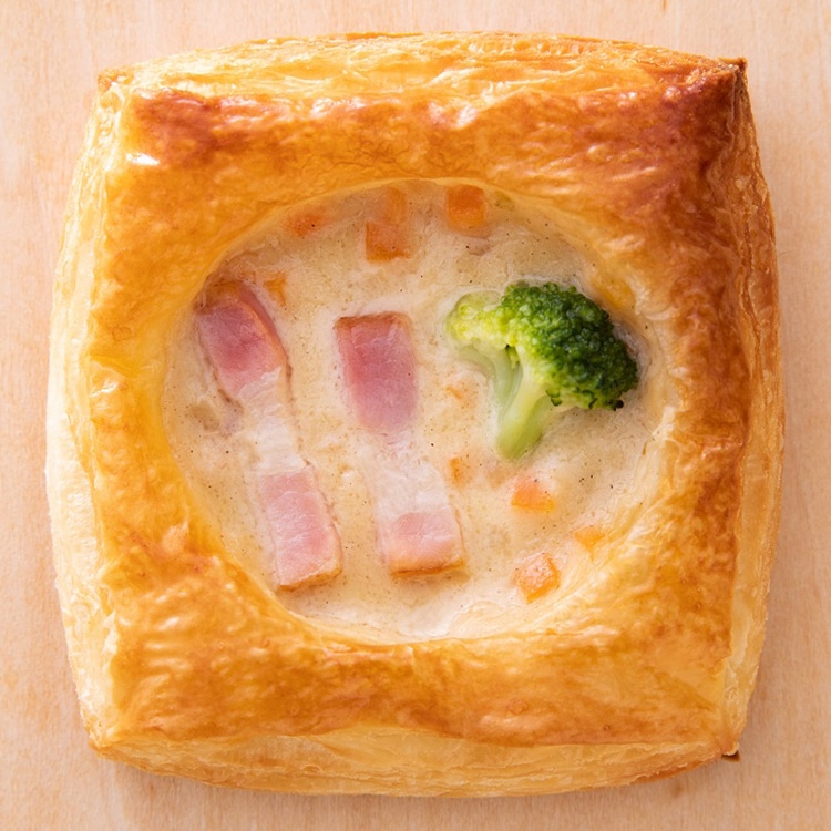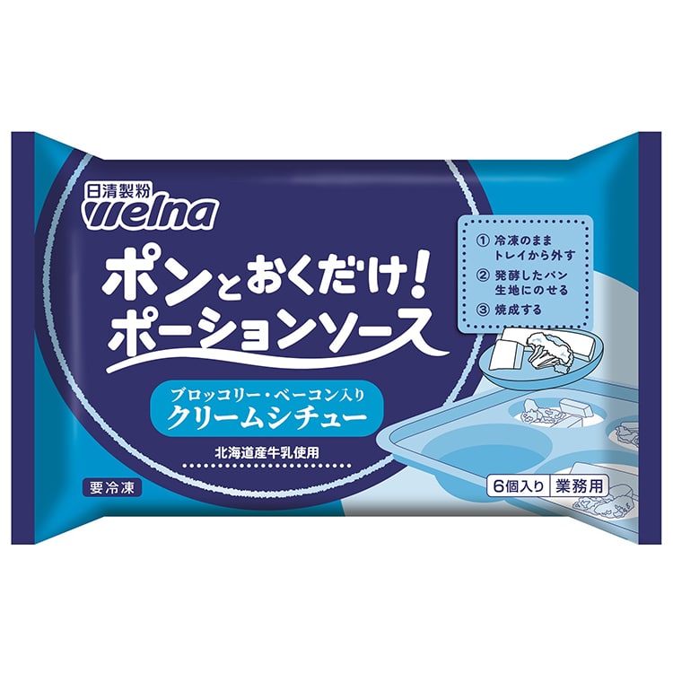 生地の上に冷凍のまま置いて焼成することでおいしいフィリング入りパンができ、加熱してドレッシングやソースとしても使えます。クリームシチューソースにブロッコリーとベーコンをトッピングし、こだわりのソースとゴロッとした具がひとつになった新感覚の具材一体型冷凍ソースです。