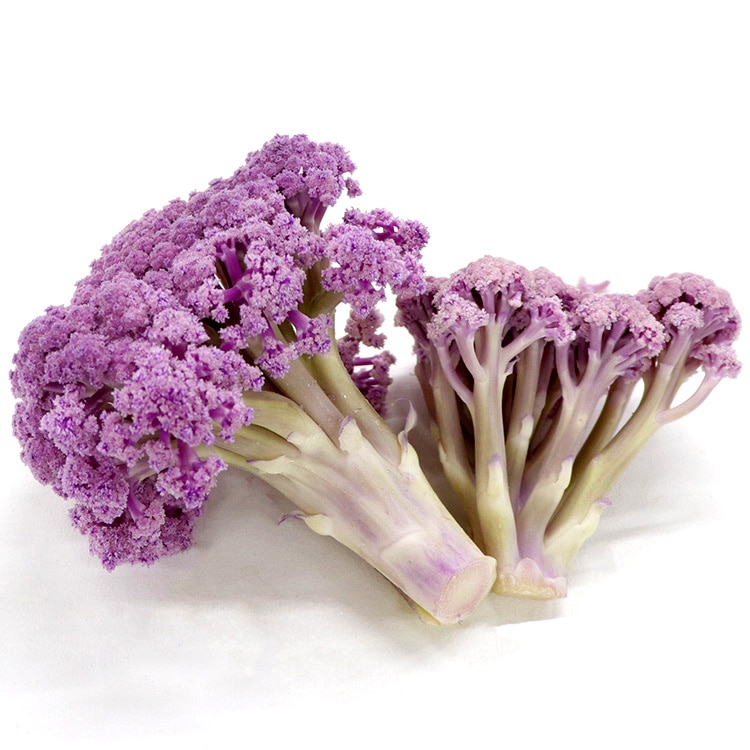 花蕾が鮮やかな紫色で、白と同じく食感を楽しむことができるスティック型のカリフローレです。カリフローレと同様ですが、色合いを楽しむ為に湯通しの際にお酢を少々加えると色が鮮やかです。白とのカラーリングで料理も華やかになります。