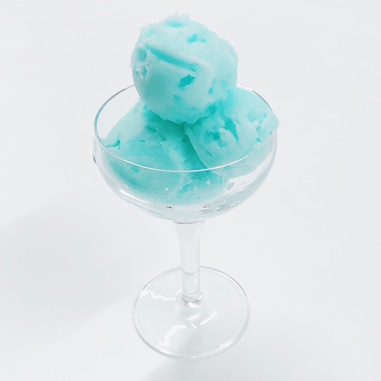 甘さひかえめでさっぱりとしたソーダアイスに、清涼感のある炭酸氷を混ぜたアイスです。炭酸感を出す為、大きめの炭酸氷を選別し、リンゴ果汁でコクを出し急速冷凍により、滑らかな食感に仕上がっています。ディッシャーですくい、容器に入れお召し上がりください。