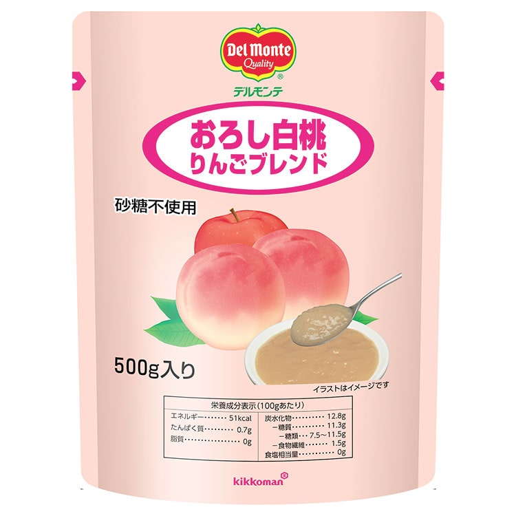 時間が経っても色の変わらないデルモンテのおろしシリーズです。3種の白桃を使用し白桃らしい香りを実現しました。生の果物とほぼ同等の栄養価で、砂糖不使用の自然な味わいです。開けるだけで使えるので、皮むきやすりおろす手間が不要で時短にお役立ちします。また、UDF区分「舌でつぶせる」に該当するので咀嚼困難な方にもおすすめです。