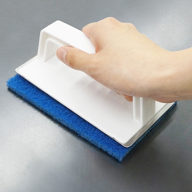 鉄板などの高温になる厨房設備や機器・器具の洗浄にお使いいただける耐熱素材不織布です。耐熱性に優れたメタ系アラミド繊維に研磨粒子を付着させた製品で、洗浄対象物の温度を下げずにご使用になれます。専用のグリップ(HR-A08)に取り付けて使用ください。