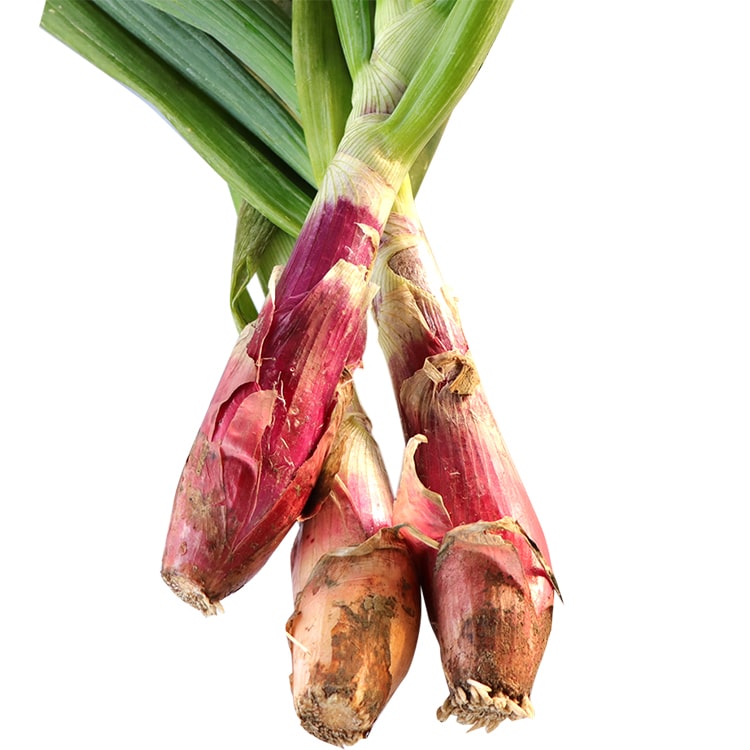 主に根の赤い部分を食べます。皮をむいていくと色が薄くなり、白に近い色に変わっていきます。加熱調理すると柔らかくなり、少し辛味もあるので、肉料理と一緒にお召し上がりいただくのがおすすめです。