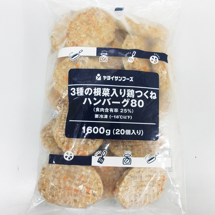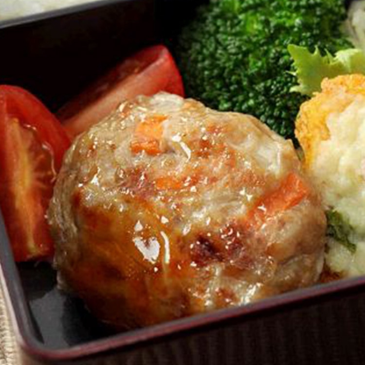 大きくカットしたゴボウ、人参、レンコンを加え、シャキシャキした食感を出した鶏肉ベースのハンバーグです。和風タイプの味付けに、隠し味でアクセントとなる生姜を加えました。調理してからお召し上がりください。