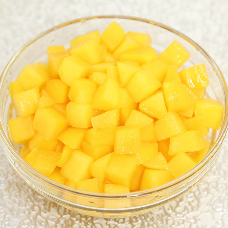 採れたての黄桃を約15mmにダイスカットいたしました。開封後はガラス等の容器に移しかえて冷蔵庫に入れ、お早めにご使用ください。開缶時に切り口にご注意ください。黄桃独特の風味と食感をお楽しみください。
