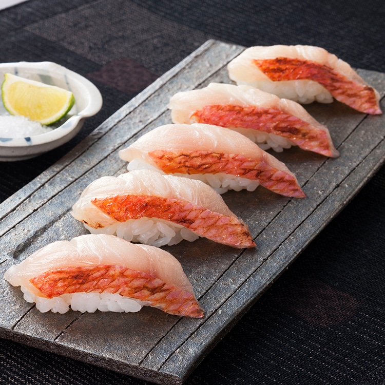 塩麹を使用し、一晩熟成して皮目を香ばしく炙り、金目鯛の美味しさを引き出しています。皮目の赤色が映え、お刺身、お寿司にお使いいただけます。解凍後そのままお召し上がりください。