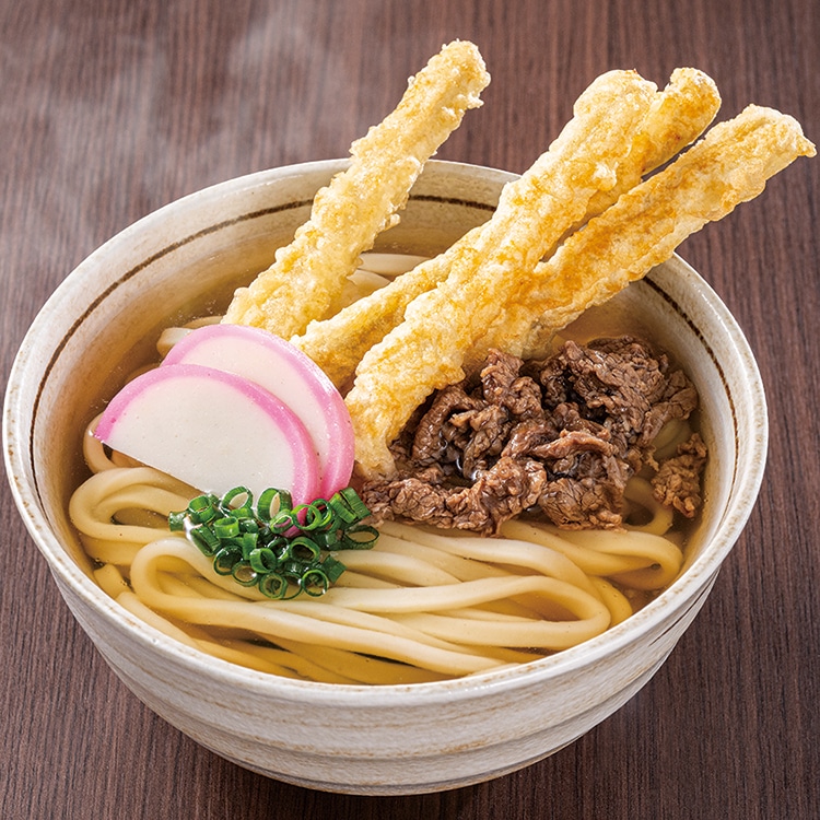 九州産小麦を使用し、ふわっとした口当たりと麺中心の粘りがある食感が特長の博多うどんです。