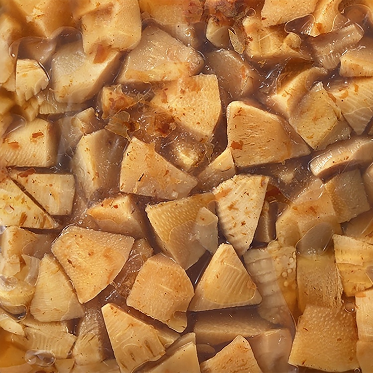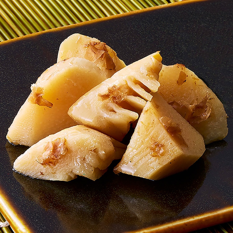 自然解凍で提供可能です。旬の時期に収穫したタケノコを、小さ目の乱切りにしてかつおだしで煮つけました。