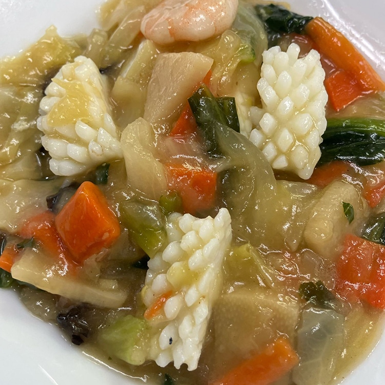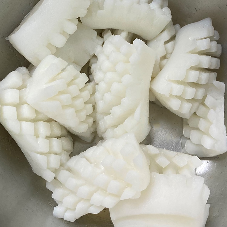 藻塩で旨味を引き立てたアメリカオオアカイカに鹿の子入れをしました。加熱すると鹿の子が開いて、見栄えが良く、中華炒め物等にお使いいただけます。