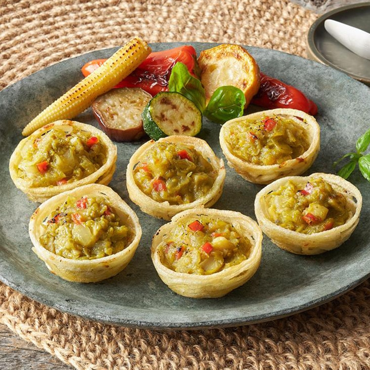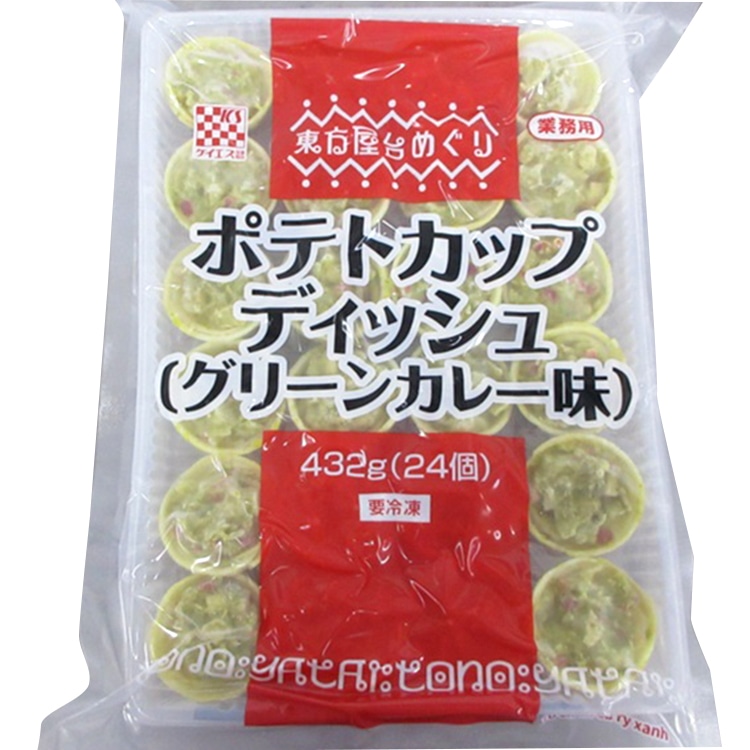 ポテトでできた食べられるカップに、グリーンカレーをイメージした具材をトッピングしました。調理後そのまま提供していただけます。