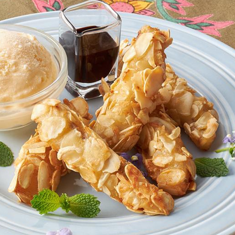 東南アジアで一般的に食べられているピサンゴレンというスイーツをアレンジしました。アーモンドスライスとココナッツの衣でバナナを包み、衣の食感がお楽しみいただけます。ソフトクリームのトッピングとしてもおすすめです。