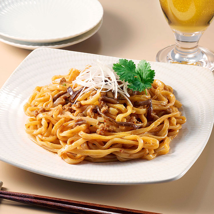少し太めのウェーブ麺に白ねりごまと芝麻醤を使ってごま風味を効かせた濃厚なソースを絡ませました。具材は混合肉味噌、きくらげ、もやし入りで、そのまま提供も可能です。さらに具材をトッピングしてアレンジするなど、様々なシーンでお使いいただけます。