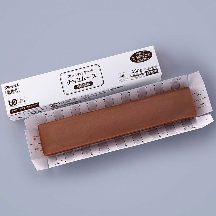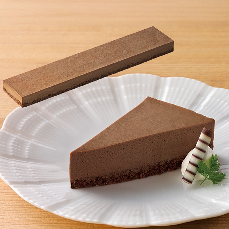 カカオマスとココアパウダーを使用し、カカオのコクと香りを生かした口どけなめらかなチョコムースを、シロップを染み込ませたスポンジに重ねたチョコケーキです。製品100Gあたり食物繊維4.9Gで、お酒不使用です。
