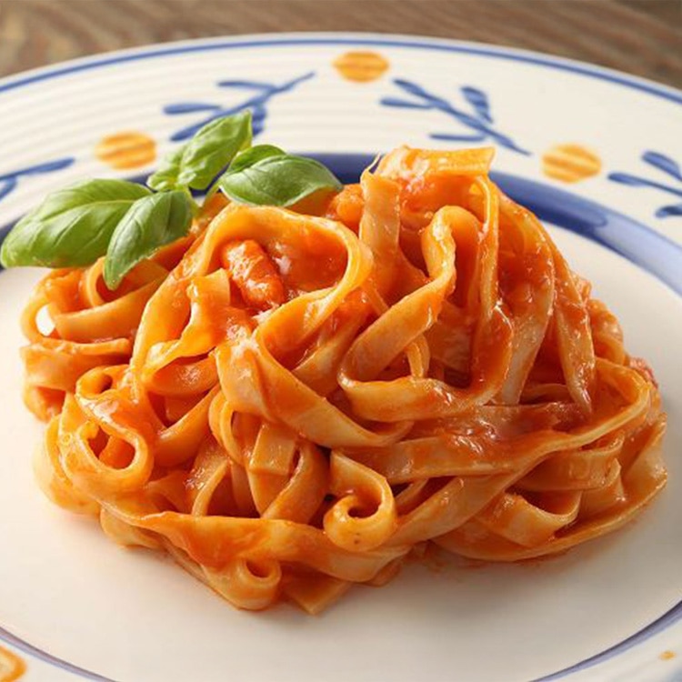 完熟トマトのピューレーづけとペーストに紅ずわいがに・生クリーム・魚介エキスを加えた、さわやかな酸味とまろやかなコクが融合したトマトソースです。コシがありもちもちとした食感が特長のフェットチーネを使用しています。調理してからお召し上がりください。