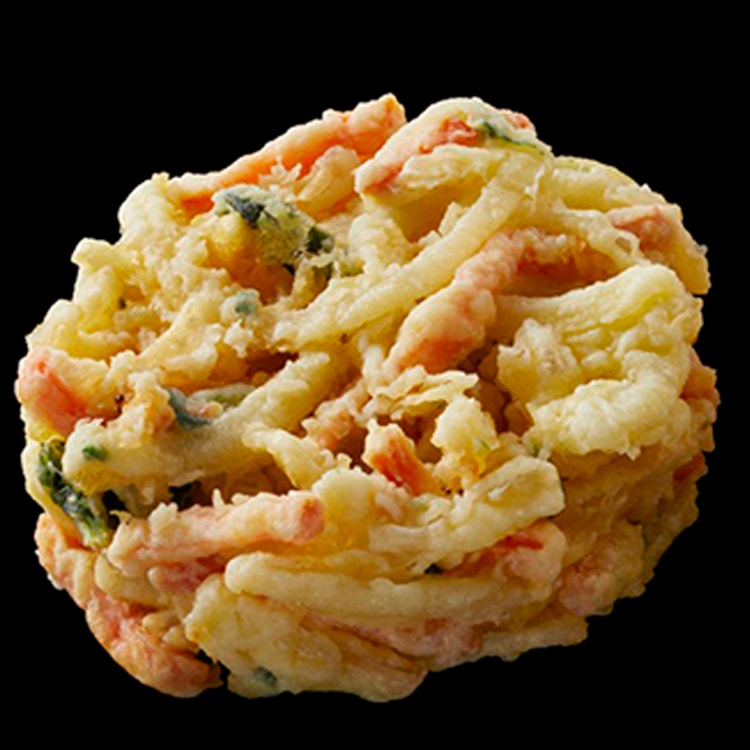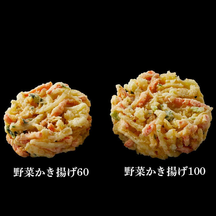 具材にたまねぎ、にんじん、小松菜を使用し、ひとつひとつ手揚げをすることで、中までしっかり均質に火入れしています。時間がたってもサクサクとした触感です。