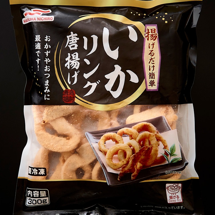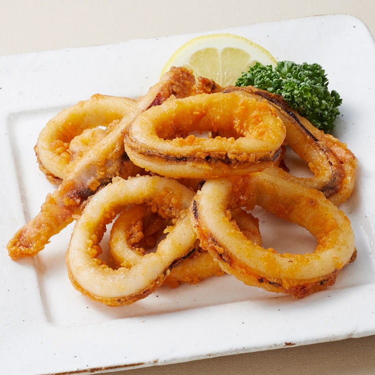 やわらかい食感に仕上げたいか唐揚げです。粉付け品で未加熱です。耳と胴体(リング)を配合しています。