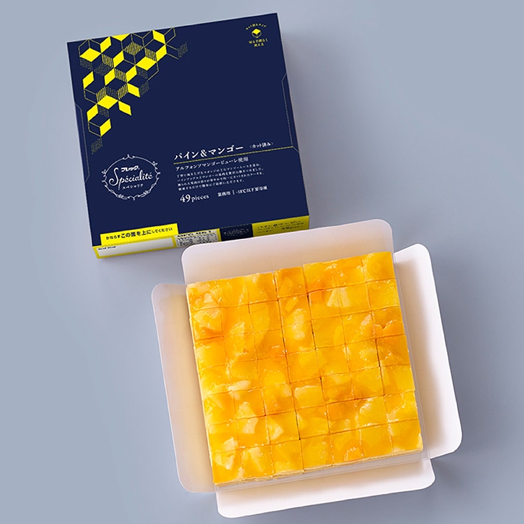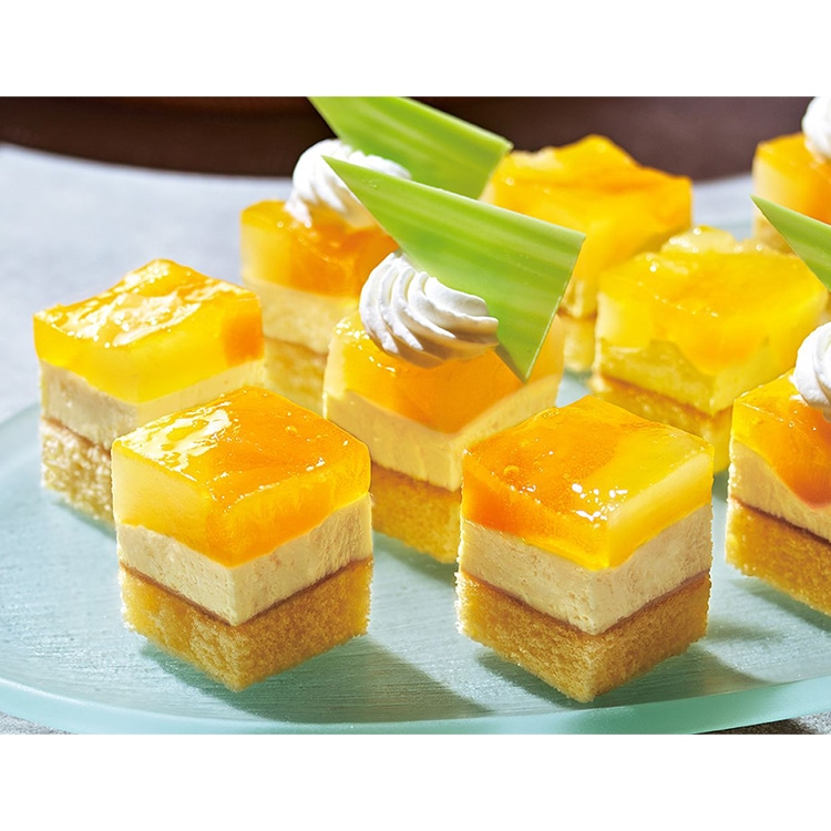 マンゴームースの上にパインアップルとマンゴーの果肉を敷き詰めた華やかなカット済みケーキです。