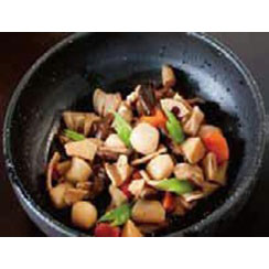 里芋、たけのこ、蓮根、ごぼう、人参、しいたけを薄味で炊き上げました。ひとつひとつの素材の味が活きています。味付けは薄味であっさり美味しく仕上げ、手作り感を重視しました。