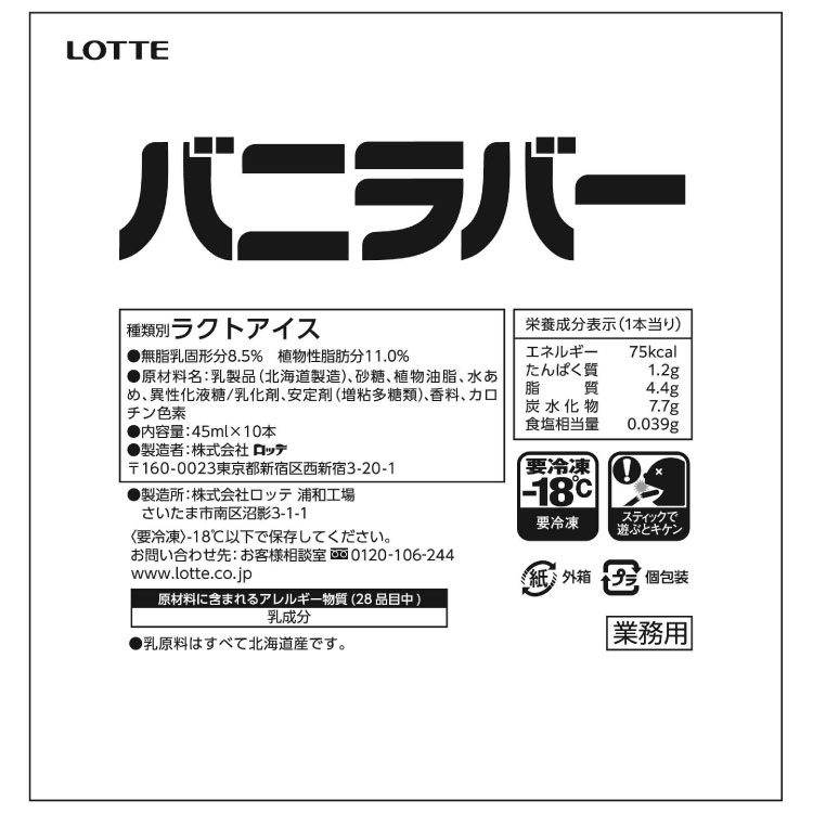 北海道産100%(乳原料中)使用の、ロングセラーバニラバーです。そのままお召し上がりください。