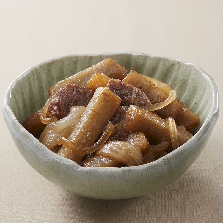 牛肉が配合されており、ごぼうを長時間加熱して柔らかくし、存在感のある副菜に仕上げました。食塩相当量は1G/100Gです。自然解凍でお召し上がりいただけます。