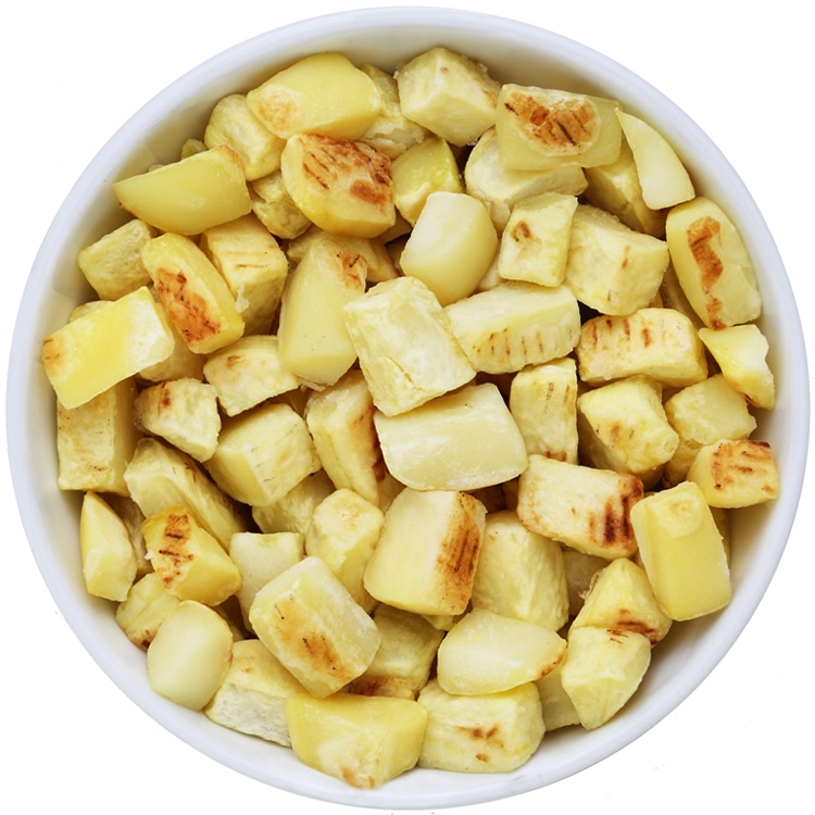 果肉が黄色みがかり、しっとりとした食感が特長のイタリア産ジャガイモの皮をむき、カットしグリルしました。グリルによって、いっそう引き出された旨みと甘み、香ばしい風味が特長です。加熱してお召し上がりください。