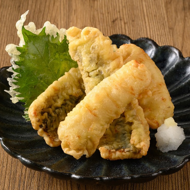 昆布で軽く締めることで余分な水分を落とし、旨味を凝縮しました。素材本来の美味しさを丁寧に引き出しています。天ぷらバッターに液卵を加えることで、ふんわりとした衣に仕上げ、身のふっくらとした食感を引き立てています。食べた時に、昆布の旨味と穏やかな香りが広がります。