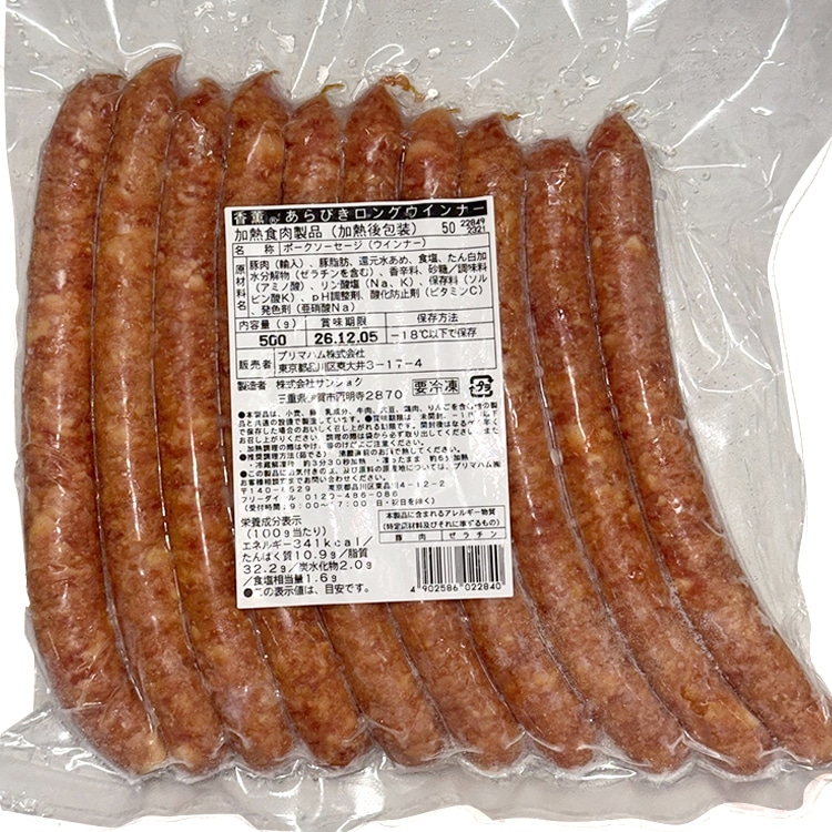 パリっとジューシーな粗挽きロングポークソーセージです。肉感と満足度が強めで、ホットドッグに最適です。