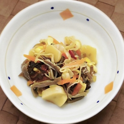 大豆もやし・人参・ぜんまい・木耳・姫竹を胡麻油の香りよい韓国ビビンバ風に仕上げました。卵や肉そぼろを加えてビビンバ丼や、冷麺などの具材におすすめです。開封後、そのままお召し上がりください。