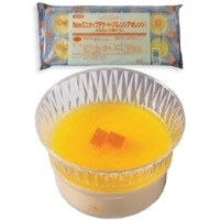 バレンシアオレンジのさのうと果汁を加えた、爽やかな酸味と甘味のムースの上に、ゼリーを重ね、オレンジピールをトッピングしました。解凍してお召し上がりください。