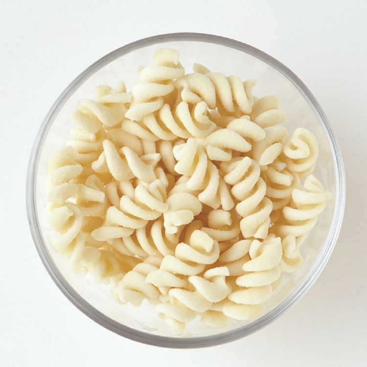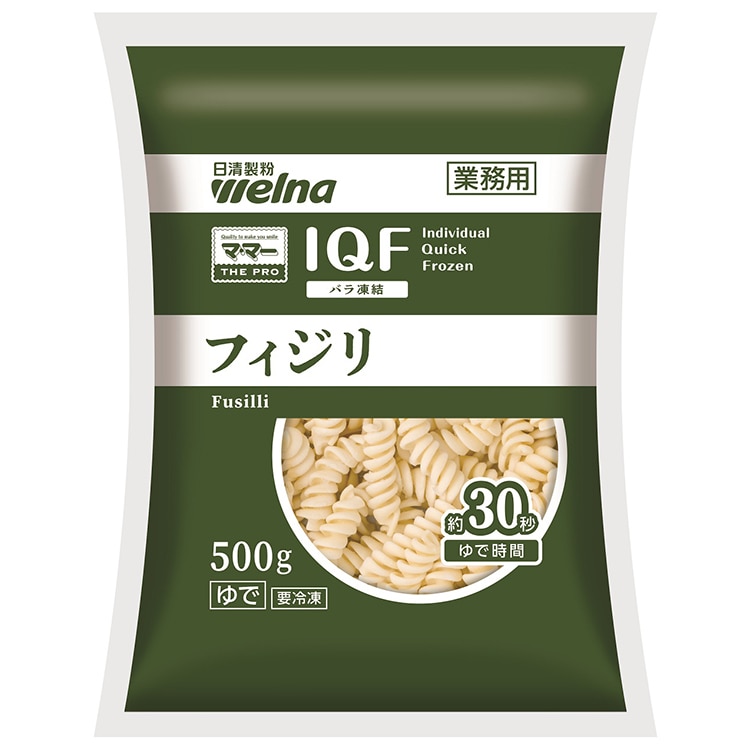 ねじれたらせん状のショートパスタで、ソースの絡みが良いため様々なメニューに使用いただけます。湯せん解凍後、調理してからお召し上がりください。