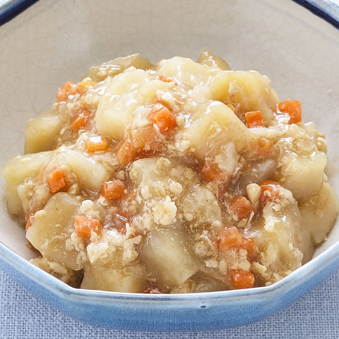 一口サイズの食べやすいジャガイモに旨味たっぷりの鶏そぼろ餡(玉ねぎ・人参入り)を和えています。解凍後、そのままでお召し上がりいただけます。